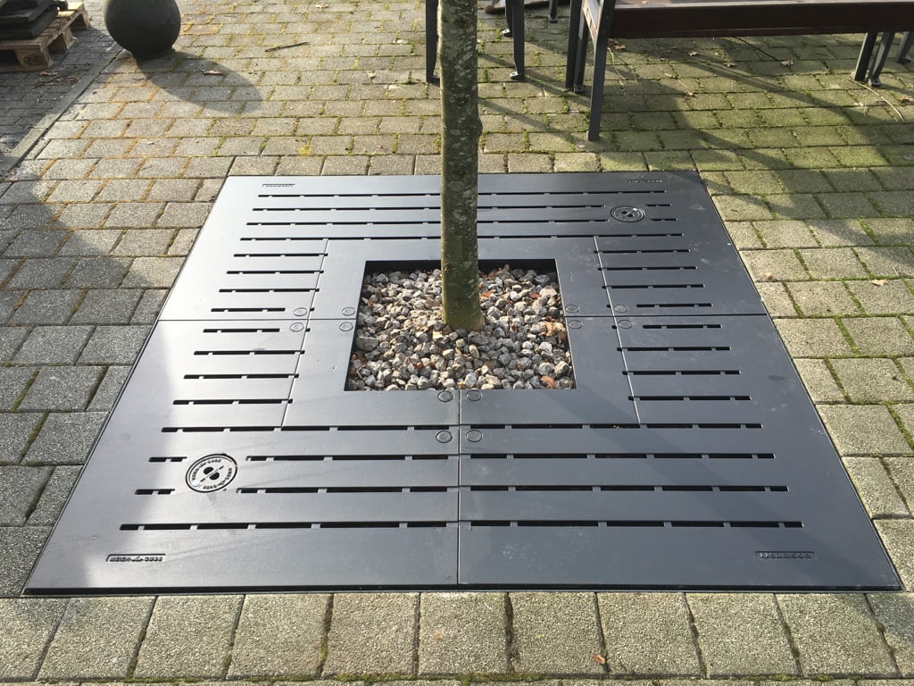 Fyrkantigt markgaller lateral i gjutjärn från JOM förhindrar punktlaster som komprimerar planteringsjorden, då säkerställs det att rötterna får luft och vatten, vilket är ett grundläggande villkor för trädets överlevnad.